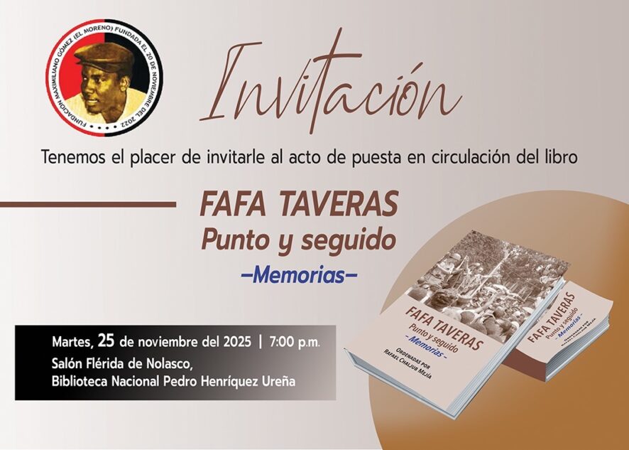 SANTO DOMINGO. – Bajo el título «FAFA TAVERAS. Punto y Seguido», ven la luz este 25 de noviembre las tan esperadas memorias del histórico dirigente izquierdista Rafael Fafa Taveras, obra que viene a llenar un vacío esencial en la historiografía política nacional. La presentación tendrá lugar esta noche a las 7:00 en el Salón Florida de Nolasco de la Biblioteca Nacional Pedro Henríquez Ureña, con la particularidad de que el propio compilador de la obra, el escritor Rafael Chaljub Mejía, será el encargado de exponer al público el valor de este documento testimonial.